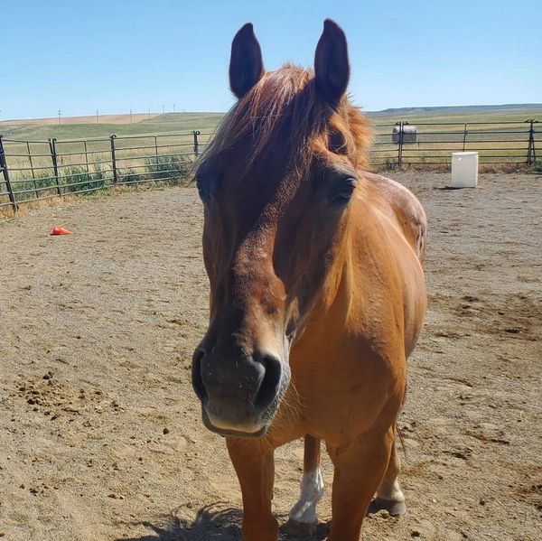22 Year Old gelding with two blue eyes. He was supposedly a lesson horse a few years ago and is now just getting back to work in our program. He is a cute little gelding standing maybe 13.2 hands with a peppy go getter personality. He has a jarring trot but a nice smooth lope. He is always checking pockets for snacks and loves to get into the toys in the arena just like Ole!