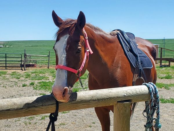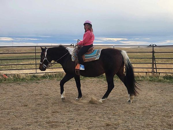 This small gelding came to us after spending 6 years in a sale barn. They used him to move cows through the sale yard. He is easy to steer, has a pep in his step, and loves to trot. He is a great horse for those riders needing a little more speed but need to spend more time working on their trot.