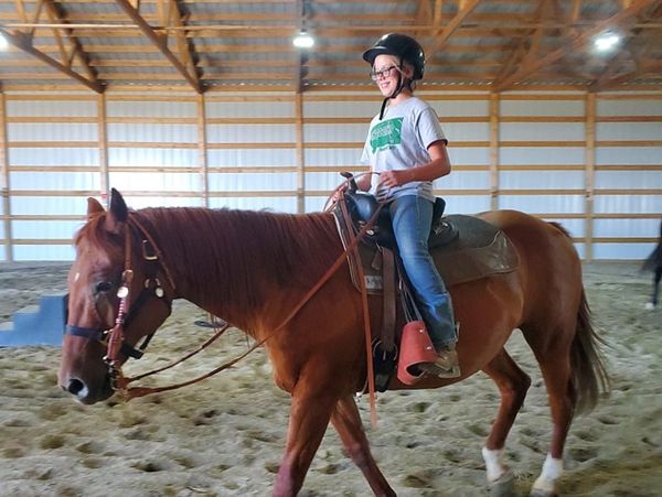 Lacy is a 18 year old Quarter Horse. She is a natural when it comes to dealing with beginners which probably comes from the fact that she came from a dude ranch. This mare is versatile but is great at teaching riders to sit deep in their seat when slowing down because she likes to stop quick!