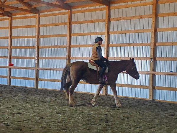 This large girl is unique- she is half Halfinger, quarter quarter horse, and quarter Percheron. She has just recently started lessons and is currently with our more advanced riders. She is sweet and energetic.